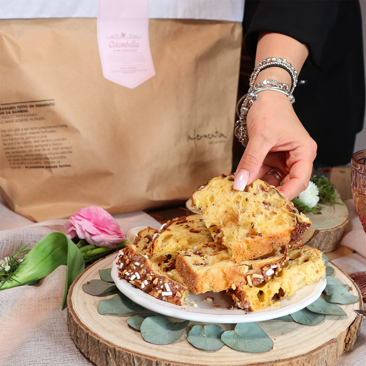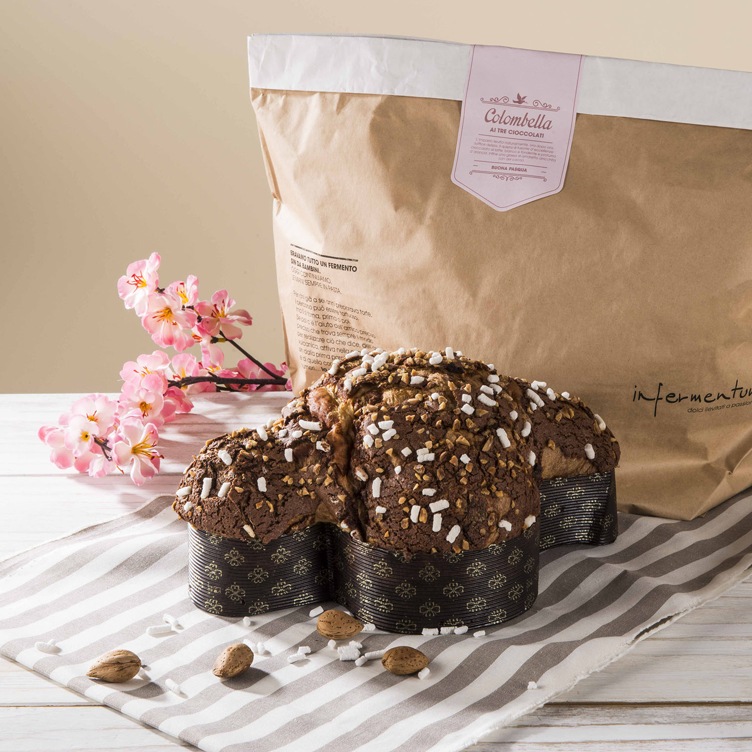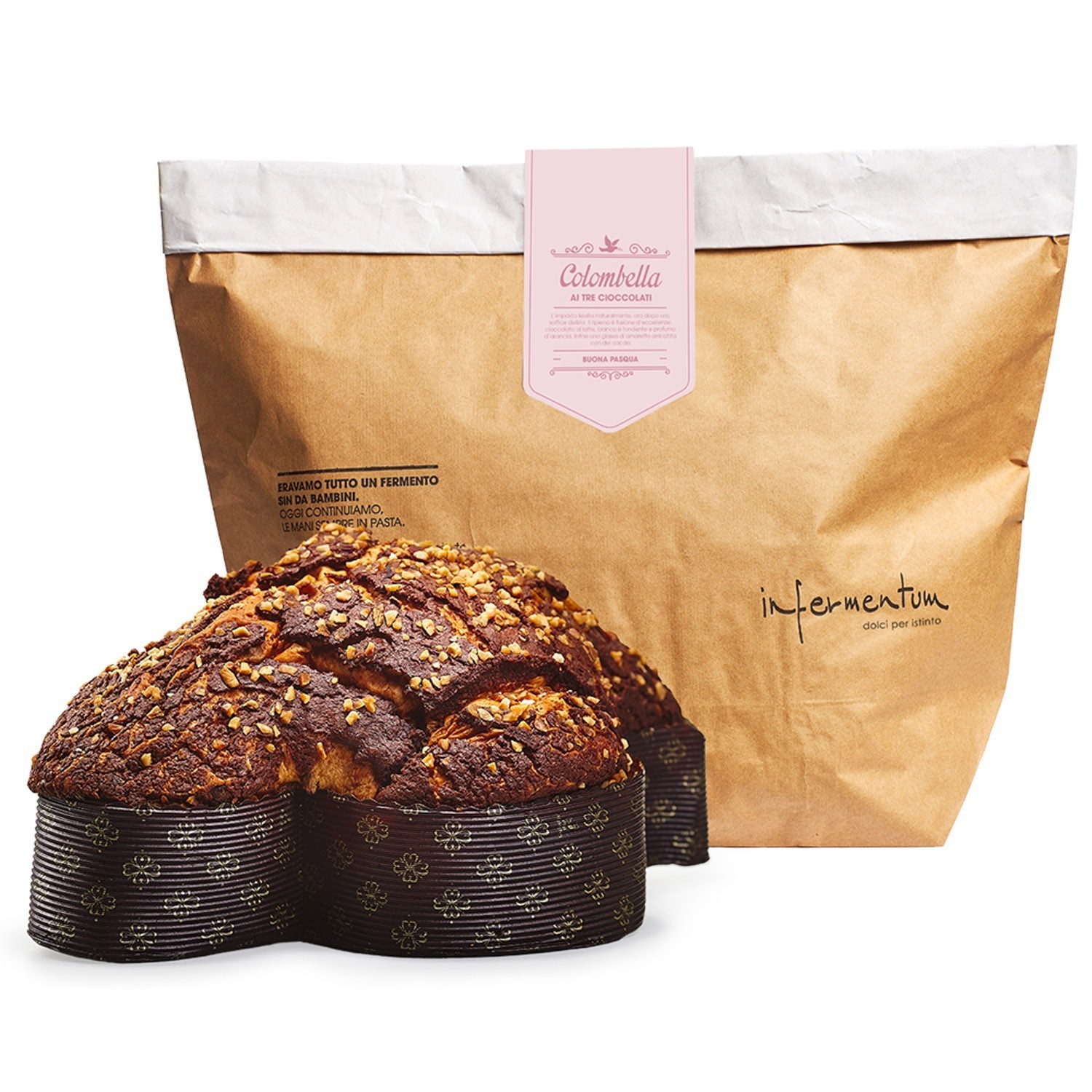 Dies ist die Variante der klassischen Colomba: die Infermentum Colomba Chocolate. So süß wie ihr weihnachtliches Gegenstück, der Schokoladenpanettone. Sie ist zweifellos der köstlichste Moment zu Ostern, einfach unwiderstehlich für Schokoladenliebhaber. Der Teig geht stundenlang auf natürliche Weise auf und bildet eine superweiche Textur, gefüllt mit drei Schokoladensorten – Milch, Weiß und Zartbitter – umhüllt vom Duft von Orange. Abschließend gibt es noch den verführerischen Zuckerguss, angereichert mit einer großzügigen Menge feinem Kakaopulver. Hinweis: Es ist keine Schokoladencreme enthalten, nur Flocken im Teig. Diese köstliche italienische Ostertaube ist das Highlight zu Ostern.
