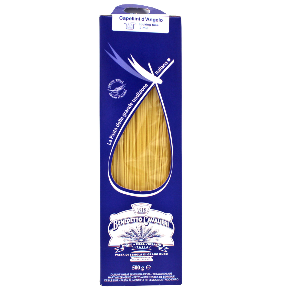 Capellini d’Angelo Pasta, auch Capelli d’Angelo oder „Engelshaar“ auf Niederländisch genannt, ist die dünnste Pasta der Welt und eine besondere Spezialität von Benedetto Cavalieri. Diese hauchdünnen Spaghetti werden ausschließlich aus Wasser und Hartweizen aus Apulien und der Basilikata hergestellt. Der Teig wird besonders lange geknetet und anschließend langsam und sehr schonend gepresst, gerollt und getrocknet, um die ideale Konsistenz zu erreichen und die natürlichen Nährstoffe und das Aroma des süditalienischen Weizens zu bewahren.