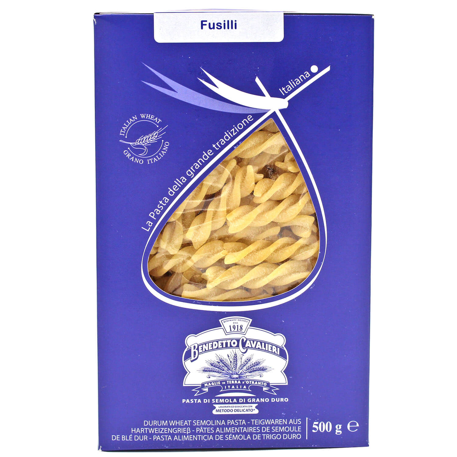 Benedetto Cavalieri Fusilli werden nach einem firmeneigenen „schonenden“ Verfahren durch langes Kneten und Pressen hergestellt. Benedetto Cavalieri-Nudeln werden langsam gezogen und bei niedriger Temperatur getrocknet.