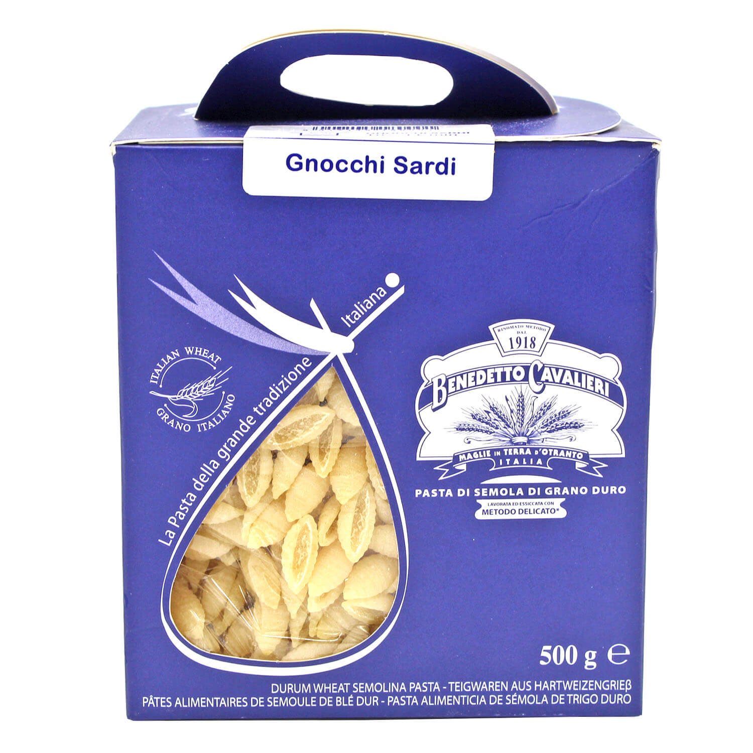 Benedetto Cavalieris Gnocchi Sardi werden nach einem vom Unternehmen festgelegten Verfahren hergestellt, das langes Kneten und Pressen beinhaltet. Die Gnochetti werden langsam gezogen und bei niedriger Temperatur getrocknet.