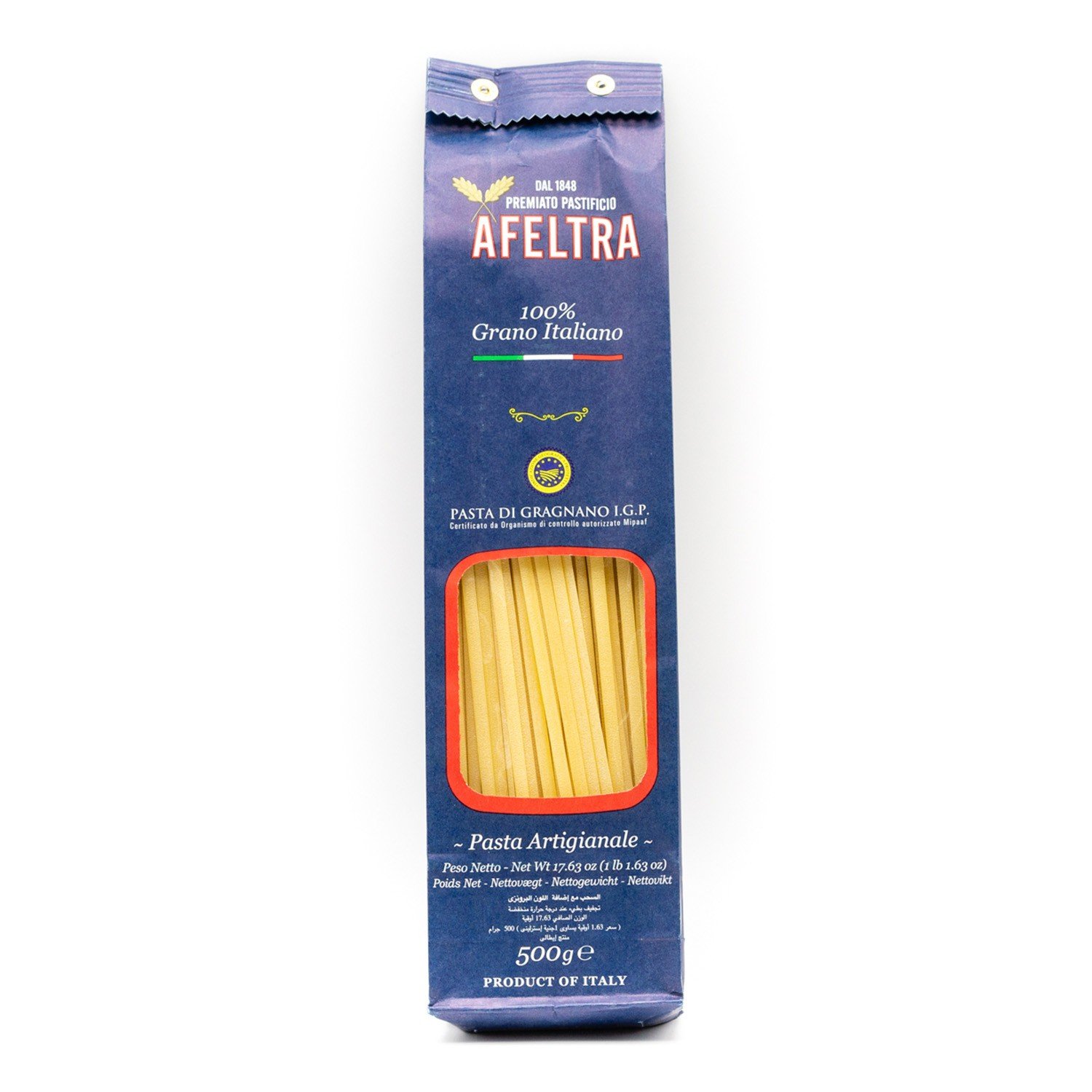 Afeltra Linguine Pasta wird aus hochwertigem, rein italienischem Weizengrieß hergestellt und ermöglicht es Kennern, den einzigartigen und unverwechselbaren Geschmack echter Gragnano-Pasta mit jeder Geschmacksrichtung neu zu entdecken. Die Bronzeverarbeitung und der langsame Trocknungsprozess verleihen der Pasta die optimale Rauheit und Porosität, um die Gewürze aufzunehmen. Diese langen Stränge ähneln Spaghetti, sind aber flacher und breiter. Sie sind etwas schmaler als Fettuccine (das sind „kleine Bänder“). Linguine passen wunderbar zu Fisch und Meeresfrüchten. Probieren Sie Linguine mit einem guten Pesto oder einer Sauce Ihrer Wahl: Die Kombination wird Sie positiv überraschen.