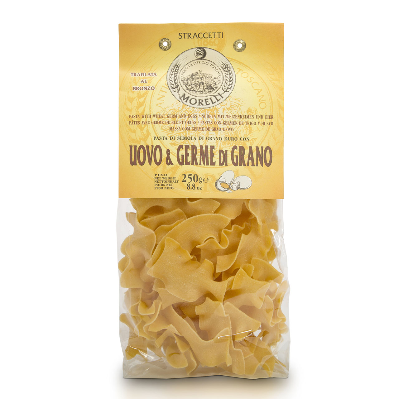 Straccetti bedeutet auf Italienisch „kleine Lumpen“, und diese klassische, gedrehte Form passt perfekt zu einer Vielzahl von Saucen. Die Straccetti-Pasta von Pastificio Morelli wird aus toskanischem Hartweizengrieß und Ei hergestellt, handwerklich verarbeitet, bronzegezogen und bei niedriger Temperatur getrocknet. Sie enthält außerdem alle wertvollen Inhaltsstoffe des Weizenkeims! Genießen Sie sie mit einer unserer Tomatensaucen oder unserer reichhaltigen, cremigen Steinpilzsauce für ein köstliches Essen.