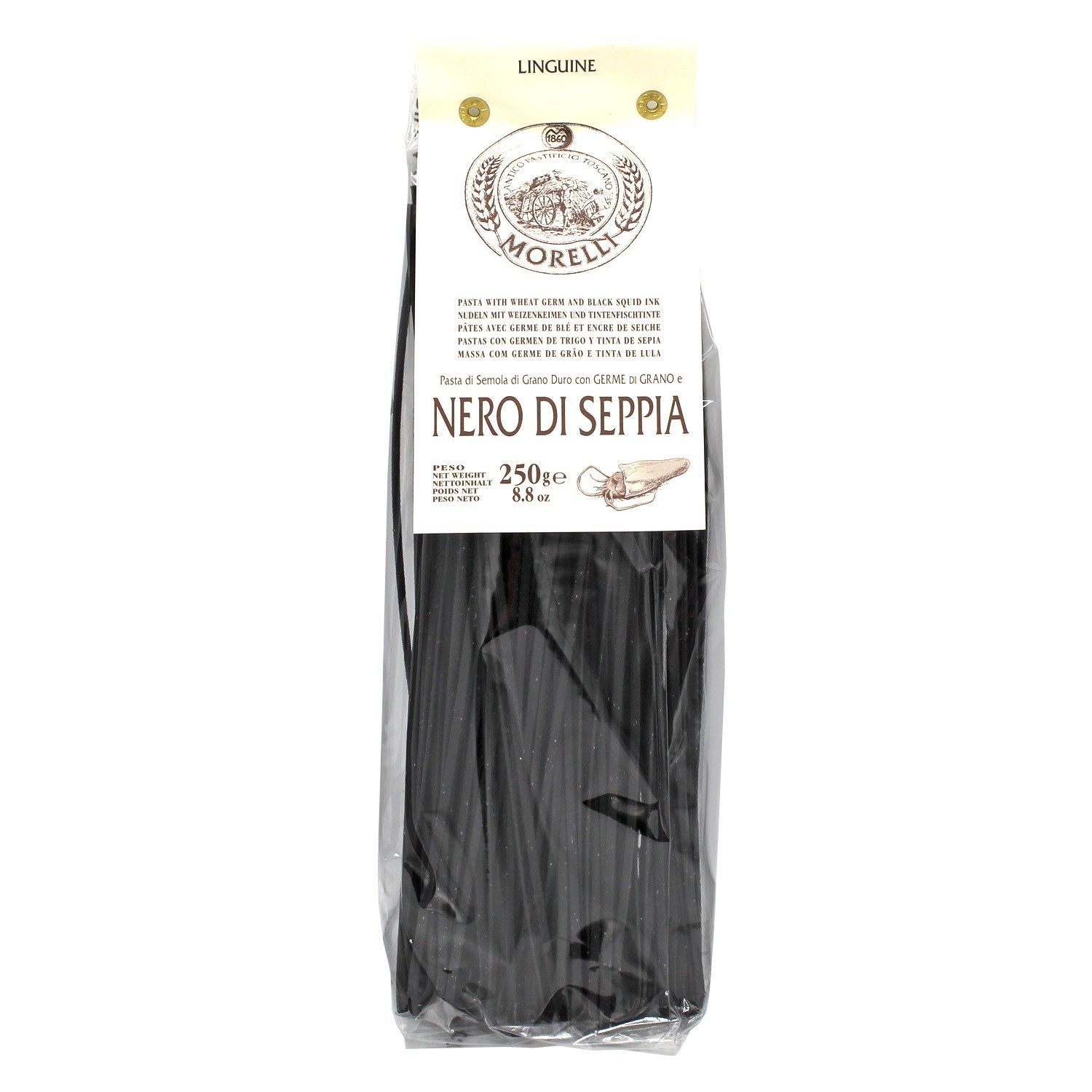 Morelli stellt seit 1860 reichhaltige und nahrhafte Weizenkeimnudeln her. Diese mit Tintenfischtinte angereicherten Linguine sind perfekt für alle, die Pasta mit Charakter lieben. Die Tintenfischtinte, auf Italienisch Nero di Seppia, wird direkt in den Teig gemischt und ermöglicht es Ihnen, die Pasta dezent zu würzen, ohne auf Gewürze zurückgreifen zu müssen. Hergestellt mit flüssiger Tintenfischtinte, ist sie frei von Aromen und Farbstoffen. Perfekt zum Beispiel zu Garnelen und Gemüse.