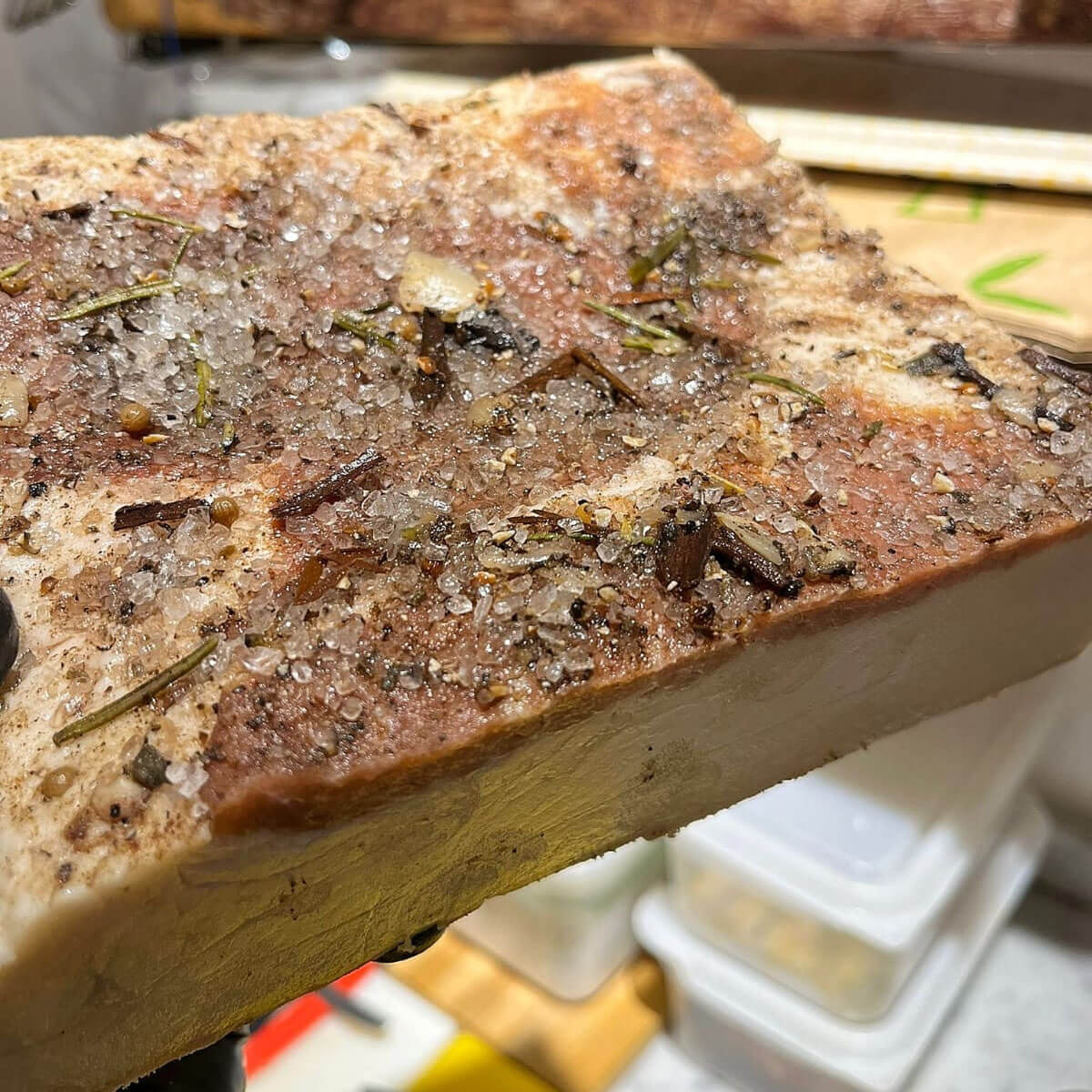 Der Lardo di Colonnata von Fausto Guadagni ist ein feines und vollkommen natürliches Pökelfleisch, frei von Konservierungsstoffen, Allergenen und Glutenquellen.