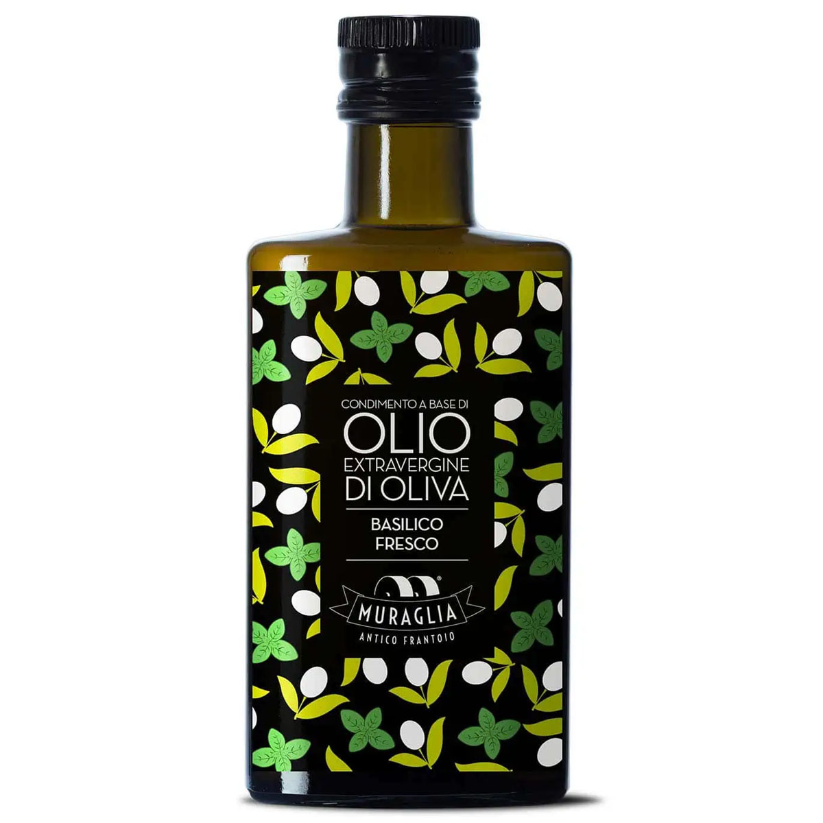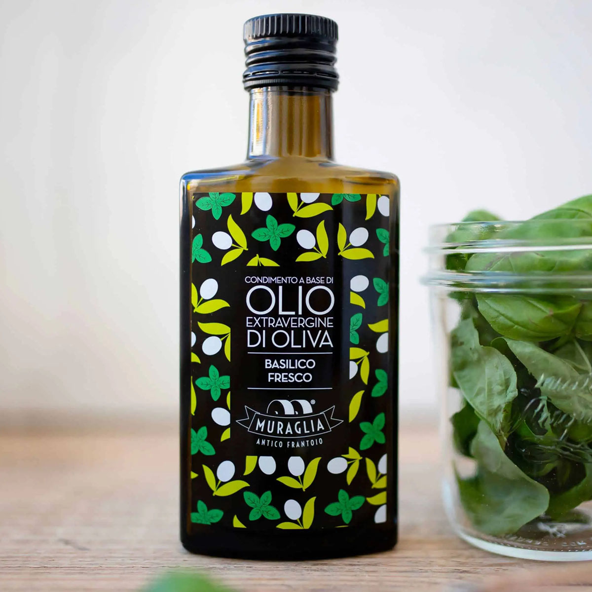 Muraglia Natives Basilikum-Olivenöl Extra aus Apulien, hier in der charakteristischen Basilikumflasche. Die Farbe ist leuchtend grünlich-gelb mit leicht schimmernden goldenen Reflexen. Aromatisiert mit 100% Peranzana-Oliven und Genua-Basilikum, besitzt es ein hocharomatisches und unverwechselbares Bouquet. Das intensive Basilikumaroma wird durch subtile Noten von grünen Tomaten, Rucola, Artischocke und Radieschen unterstrichen.