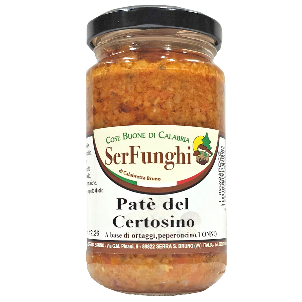 Entdecken Sie die köstliche Patè del Certosino von Serfunghi. Dieser kalabrische Gemüseaufstrich mit Thunfisch eignet sich perfekt zum Bestreichen von Bruschetta, Sandwiches und zur Zubereitung von Vorspeisen und Snacks. Diese Tapenade enthält Auberginen, Karotten, Gurken, Fenchel, Oliven, Zwiebeln, scharfe Chilischoten, Sellerie und Thunfisch.