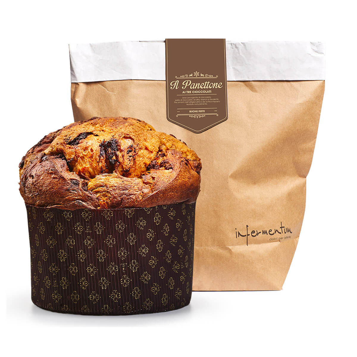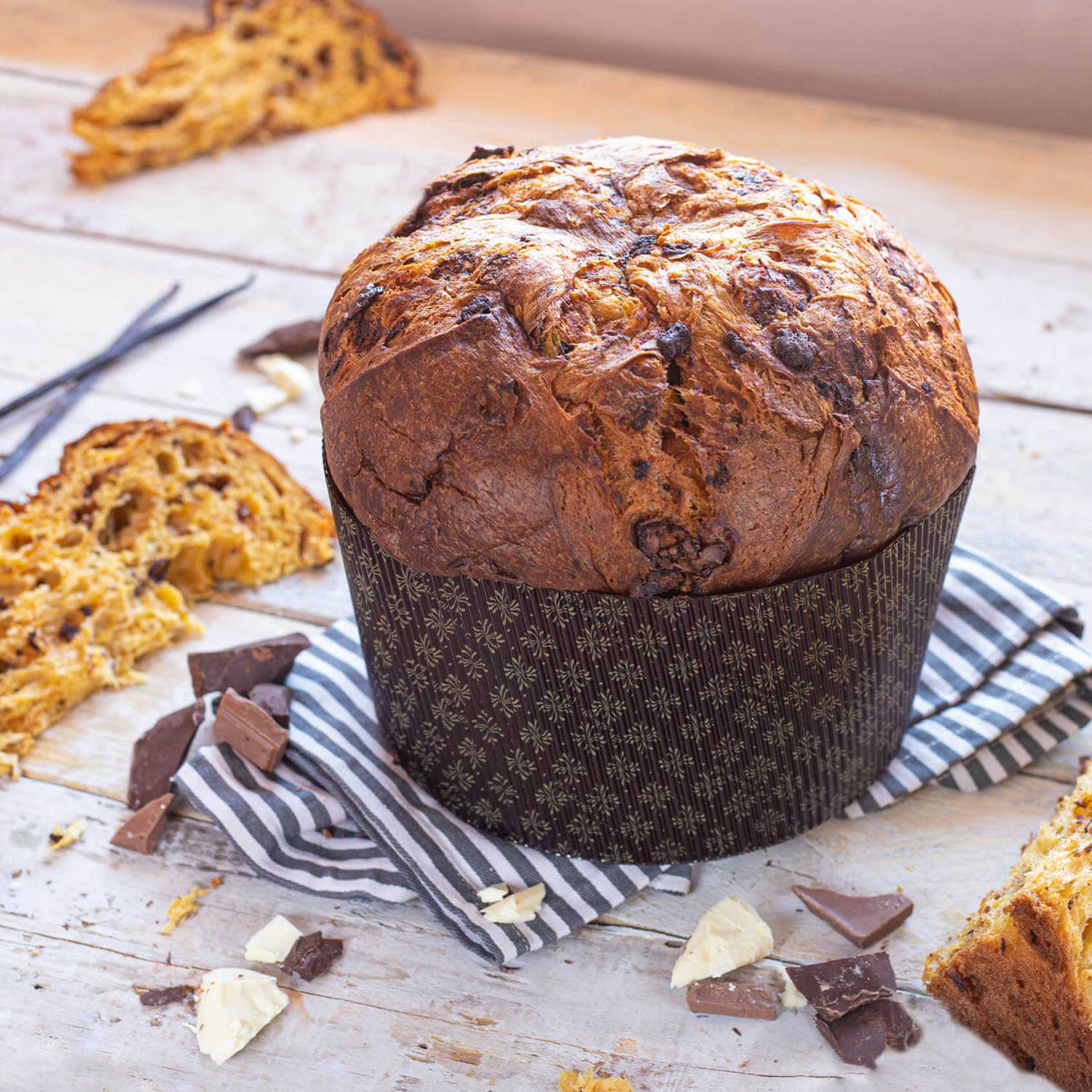 Ein Panettone mit Vollmilch-, weißer und dunkler Schokolade (61 %), ein Traum für Naschkatzen. Er wird langsam aus unserem Sauerteigteig gesäuert und mit Stücken aus Vollmilch-, weißer und dunkler Schokolade gefüllt. Er verströmt einen angenehmen Duft nach Orange und madagassischer Bourbon-Vanille – die feinste unserer Auswahl. Hinweis: Absolut keine Rosinen.