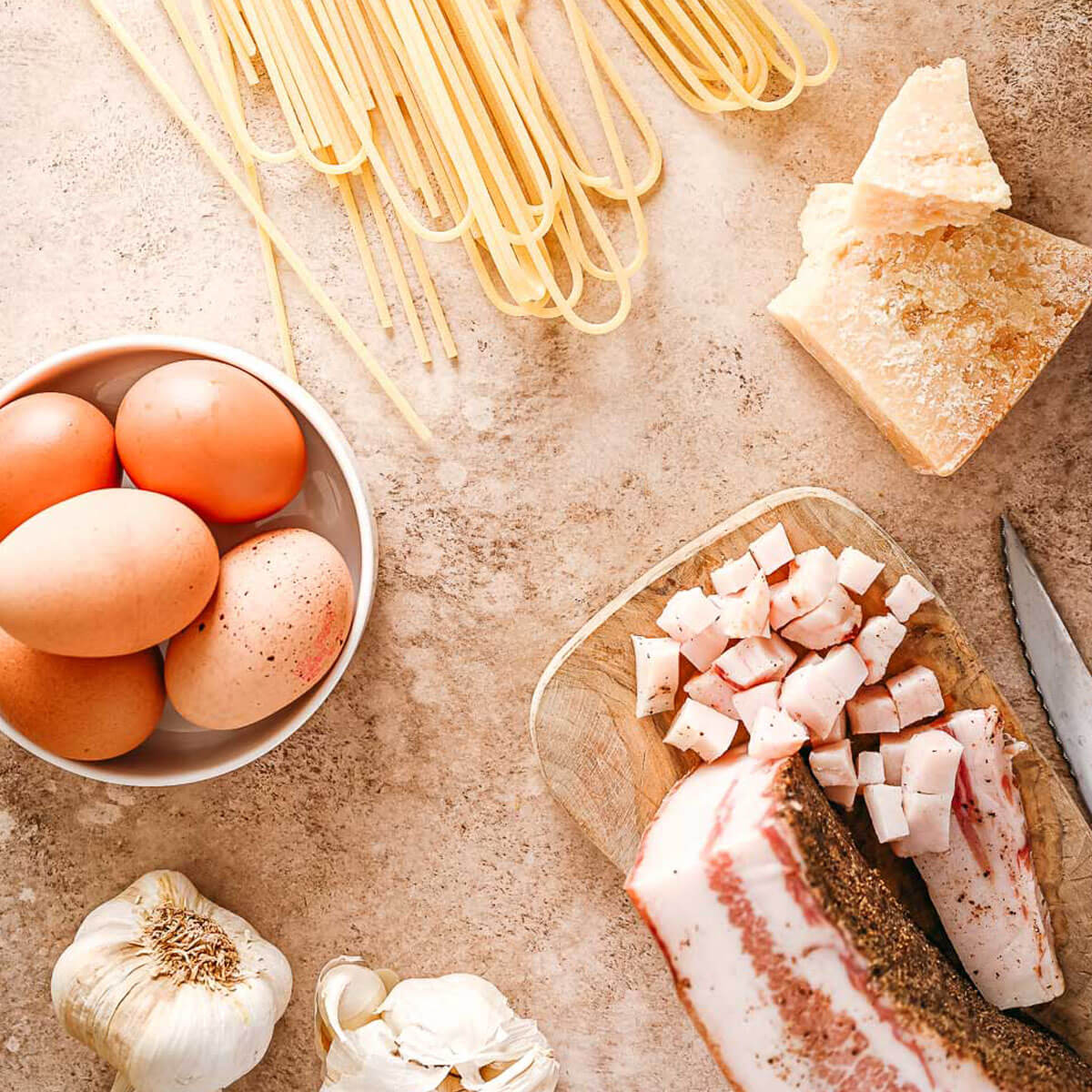Eine 100 % authentische Carbonara, ohne Sahne, Zwiebeln oder Speck! Mit knusprigem Guanciale, Pecorino und Parmesan, alles traditionell zubereitet.