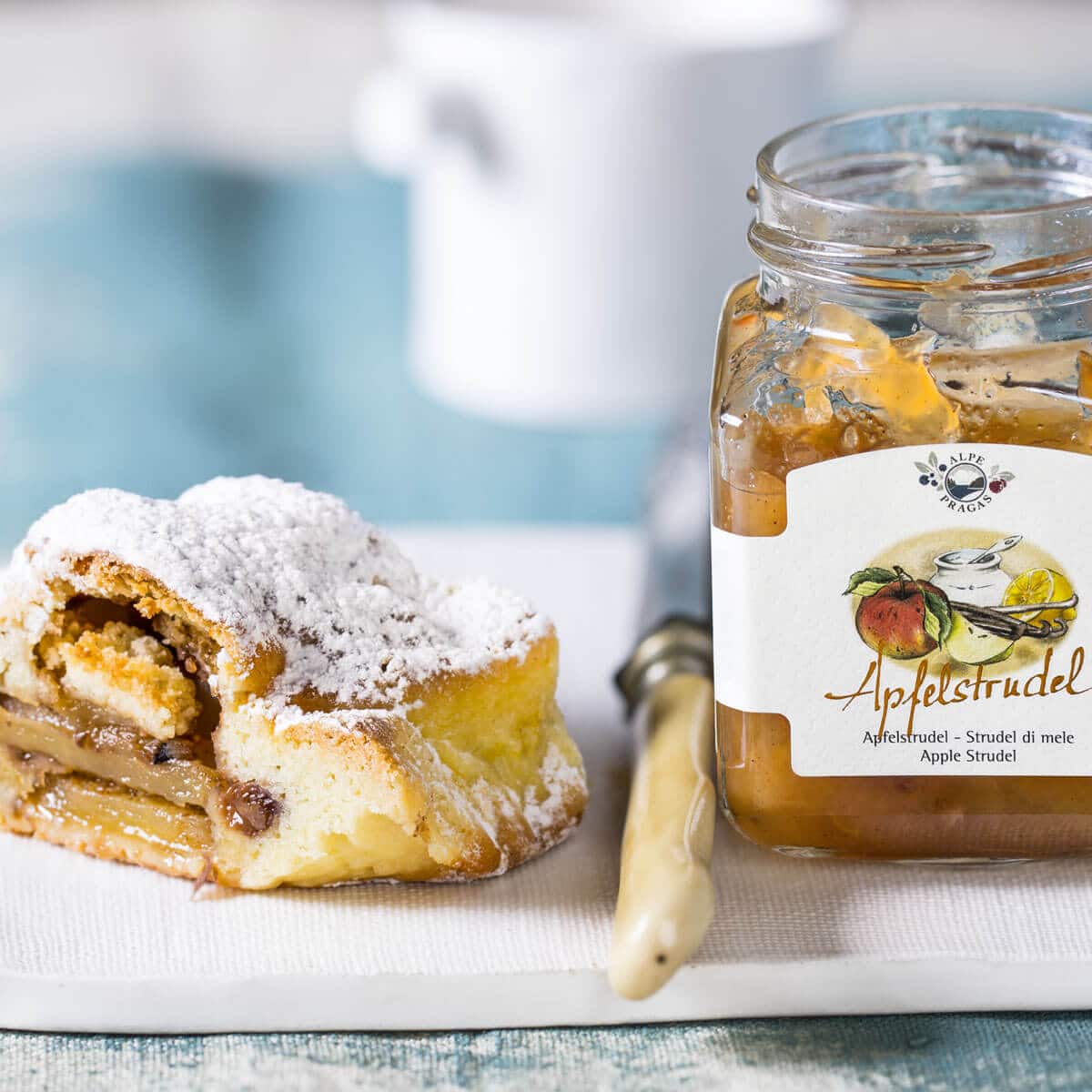 Fruchtaufstrich Apfelstrudel – hergestellt aus aromatischen Äpfeln, verfeinert mit typischen Kräutern. Ein Stück Südtiroler Tradition, köstlich zu süßen Speisen, zum Müsli oder als Dessert.