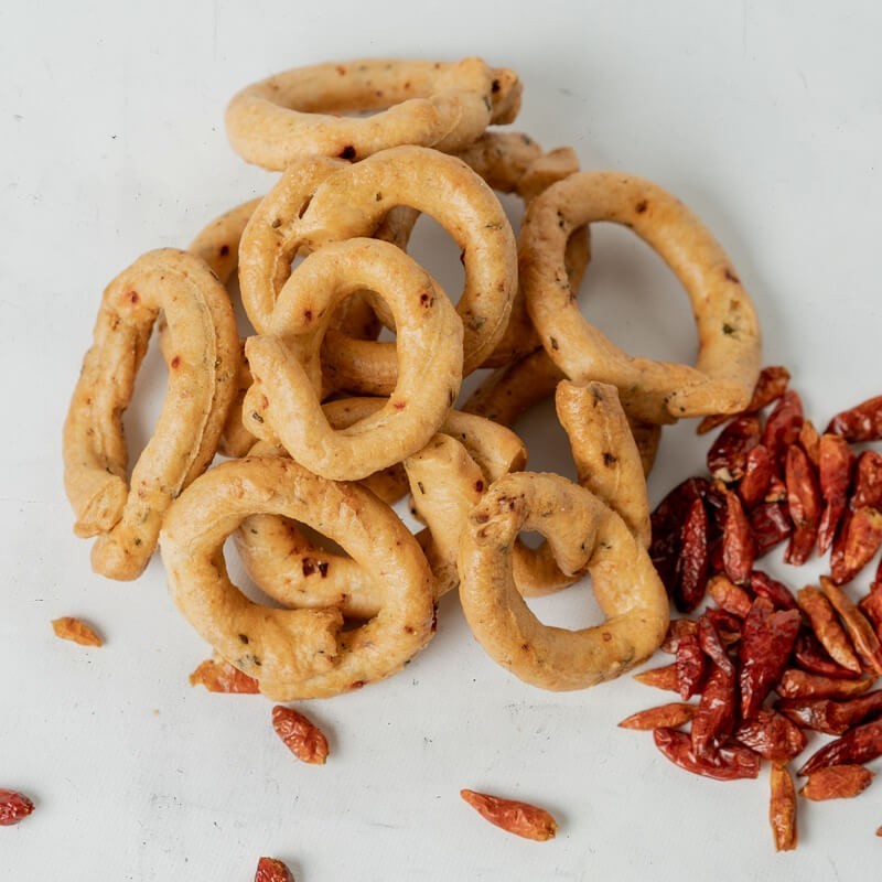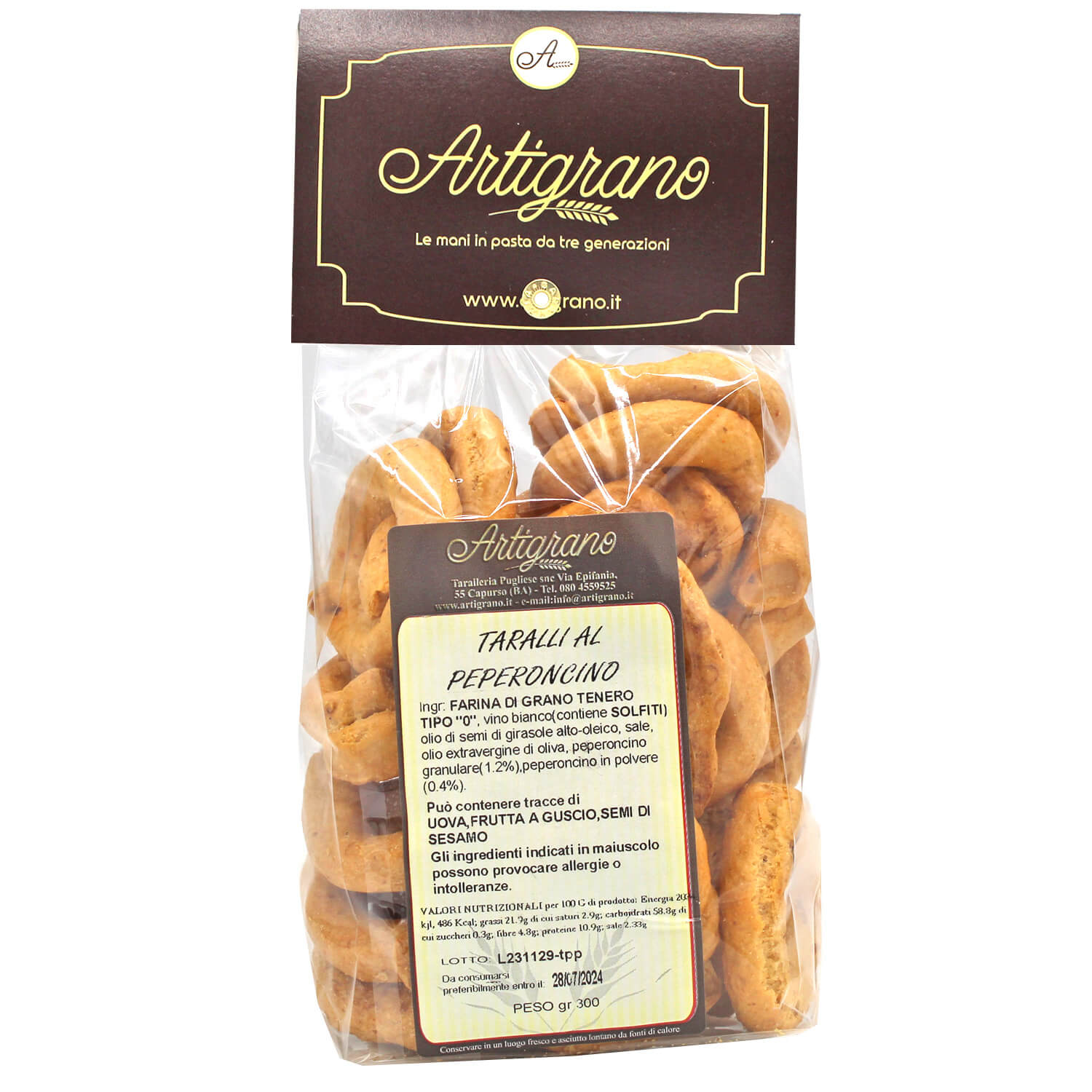 Taralli sind ein typischer gebackener herzhafter Snack aus Apulien, Kampanien und Kalabrien, der vom italienischen Landwirtschaftsministerium als traditionelles Agrarprodukt eingestuft wird. Taralli werden vollständig handwerklich und handgemacht hergestellt. Perfekt als Snack, auf einer Cocktailplatte oder zum Aperitif mit Freunden oder der Familie. Taralli schmecken köstlich zu 100 % italienischen Wurst- und Käsesorten.