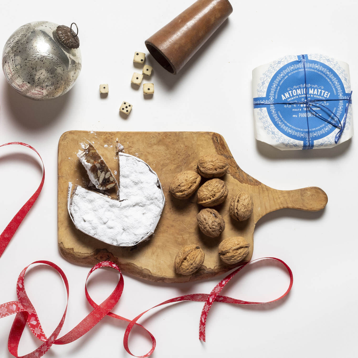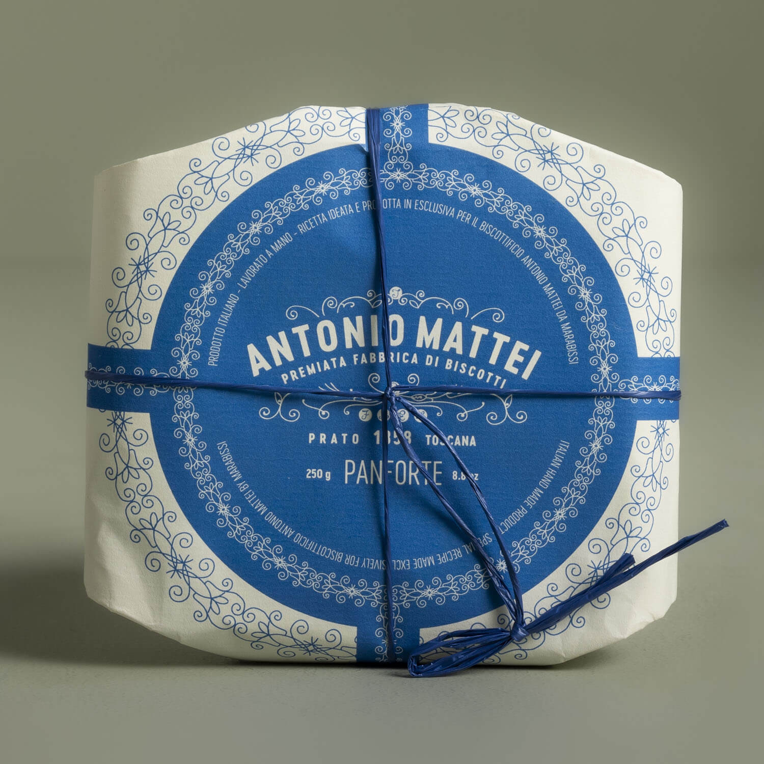 Panforte ist ein traditionelles Weihnachtsgebäck in Italien. Marabissis Panforte entsteht durch die Verarbeitung und das Backen eines Teigs aus hochwertigen Zutaten: Mehl, kandierten Früchten, Mandeln, Zucker, Honig und Gewürzen. Das Panforte, das Marabissi für Mattei kreierte, ist eine Mischung aus den beiden bekanntesten Panfortes: dem Panpepato und dem Panforte Margherita (ohne karamellisierten Zucker).