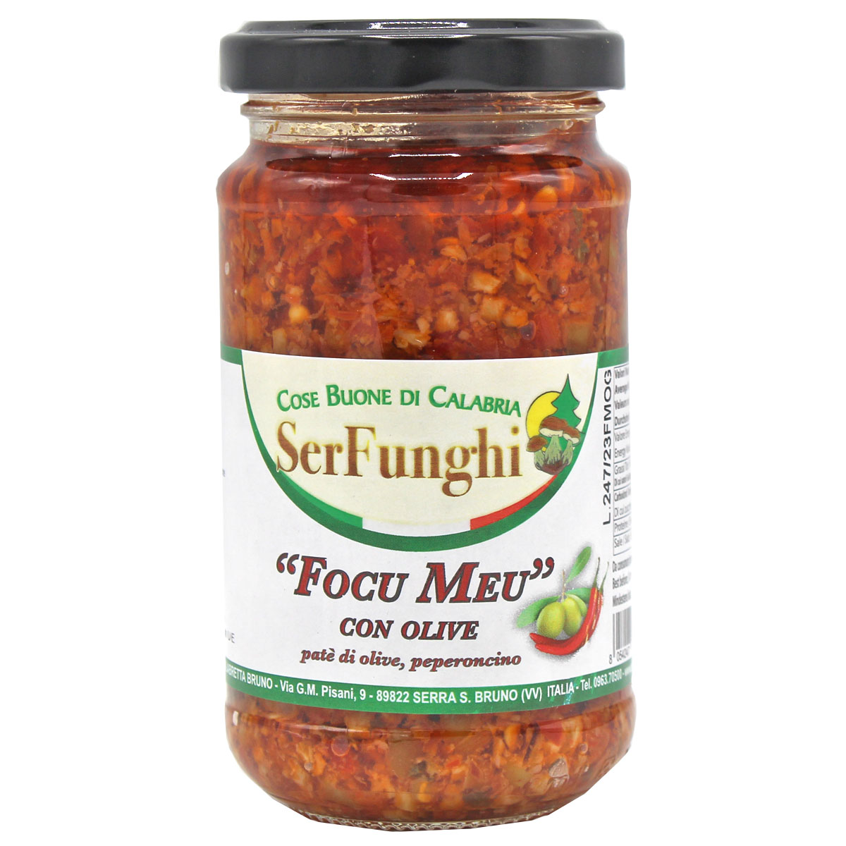 Entdecken Sie diesen köstlichen Focu Meu-Aufstrich mit Oliven und Peperoncino von Serfunghi. Focu Meu bedeutet „Mein Feuer“, ein Name, der sich von der Schärfe des Peperoncino in dieser Tapenade ableitet. Dieser kalabrische Olivenaufstrich mit Peperoncino eignet sich perfekt zum Bestreichen von Bruschetta, Pizza, Pasta, Sandwiches und zur Zubereitung von Vorspeisen und Snacks.