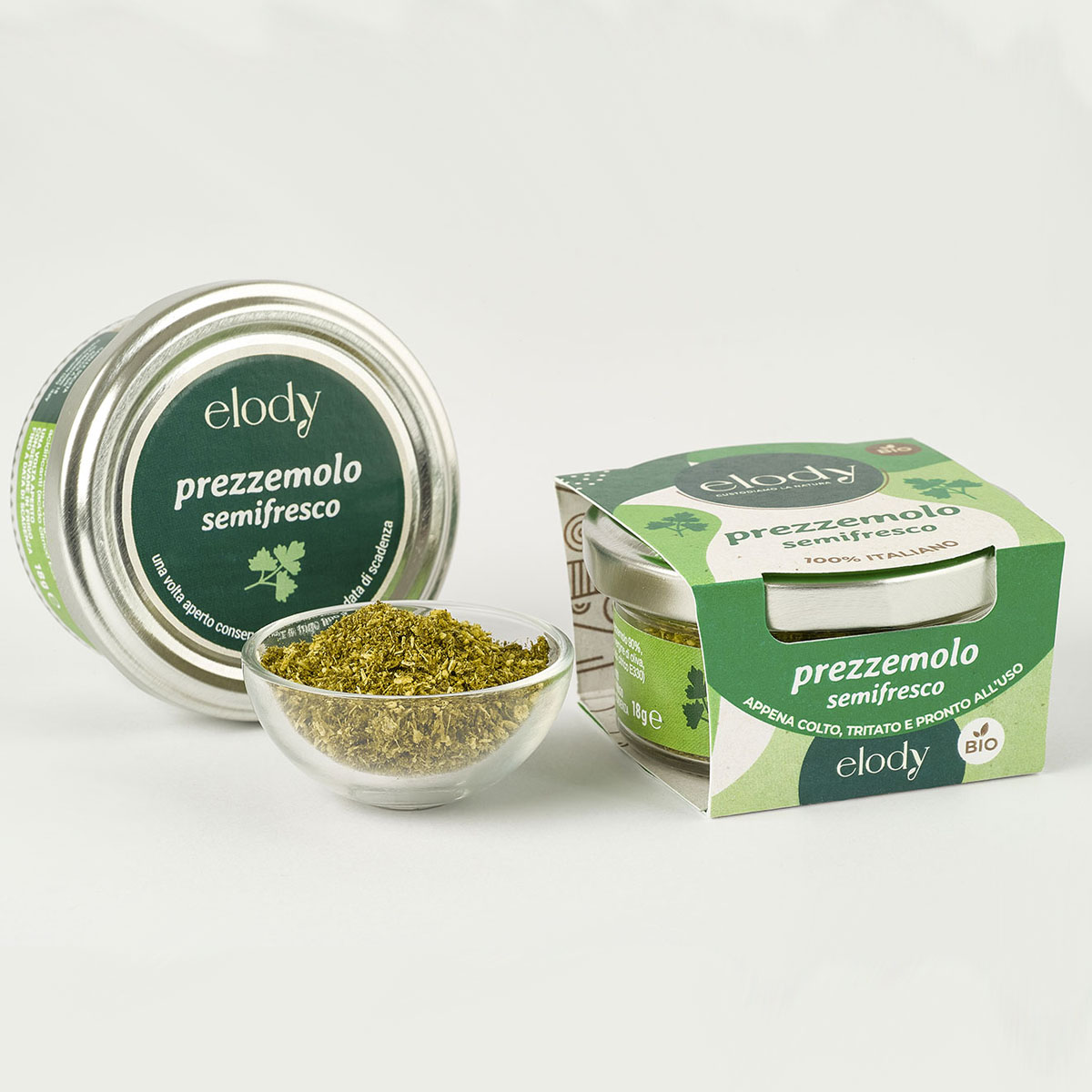 Elody Petersilie ist ein halbfrisches, teilweise getrocknetes Kraut, das bereits gewaschen, gehackt und gebrauchsfertig ist. Sie ist ideal für alle, die auch nach der Lagerung im Kühlschrank nicht auf den authentischen Geschmack eines vollkommen natürlichen Produkts verzichten möchten. Dank einer Luftfeuchtigkeit von 30 % bleibt das authentische Aroma der Pflanze zudem länger erhalten.